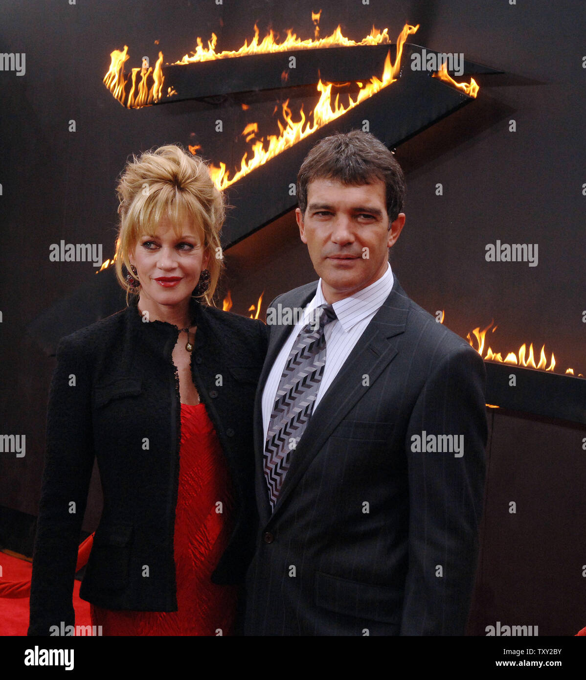 Actor Antonio Banderas A Cast Member In The New Motion Picture The Legend Of Zorro Arrives With His Wife Actress Melanie Griffith For The Premiere Of The Film At The Orpheum Theatre